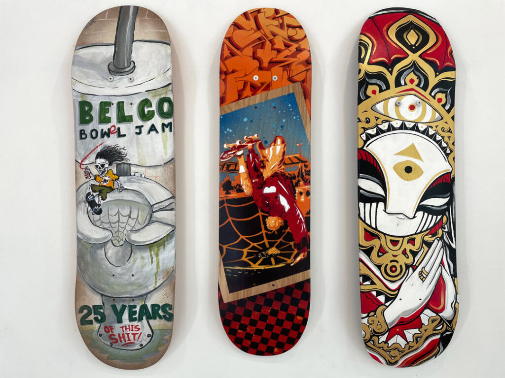 The huge display of original paintings and sculpture on skateboard decks includes artists Abyss.607, ATUNE, BASIX, BYRD, Angus Comyns, Thom Crowhurst, HOUL, JINX, KID PARIS, Mosaic Mofos, Mers, ODYSE, PAW, SETLER, Sweigz and TEAZER.