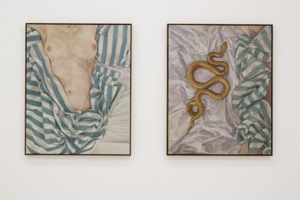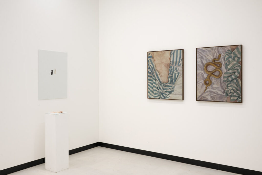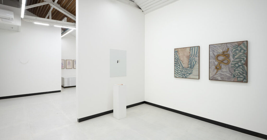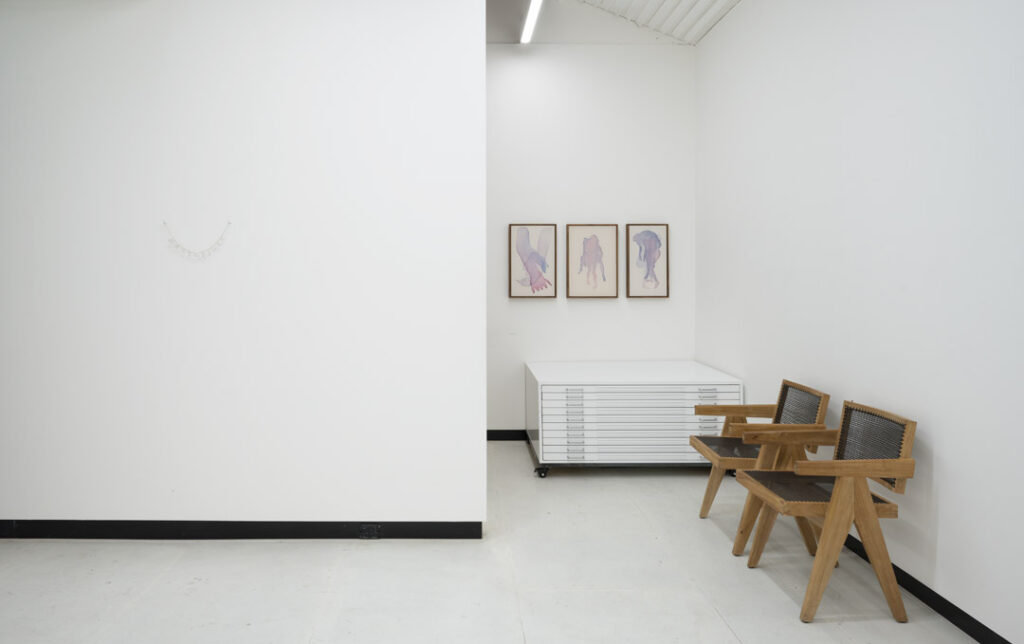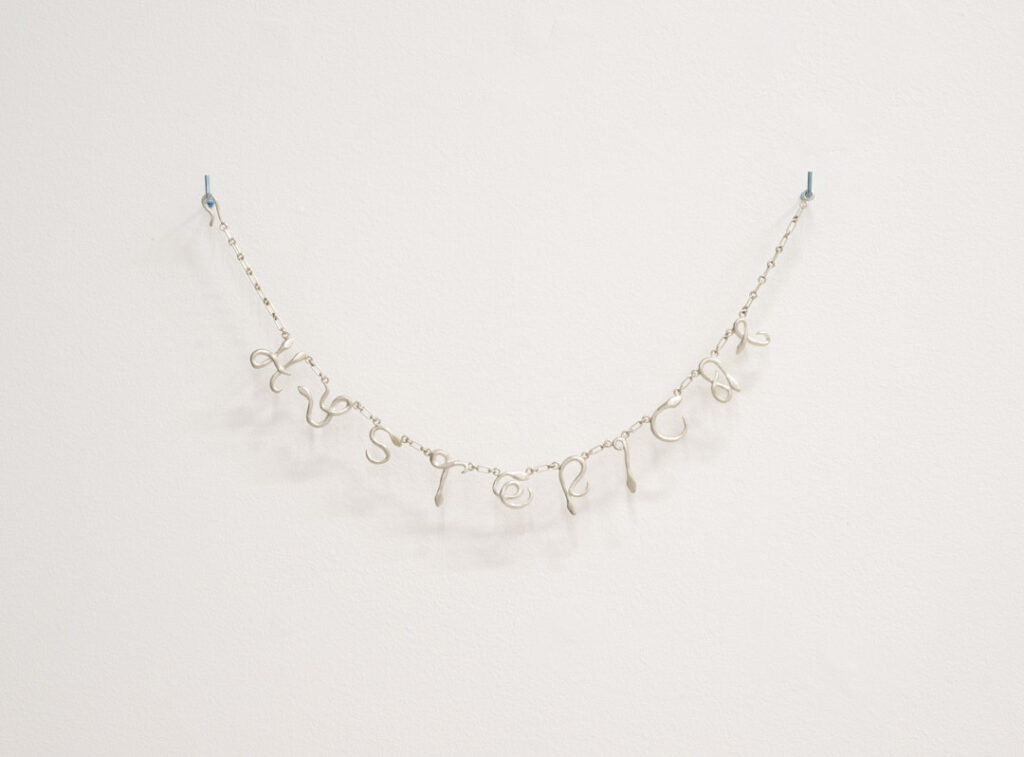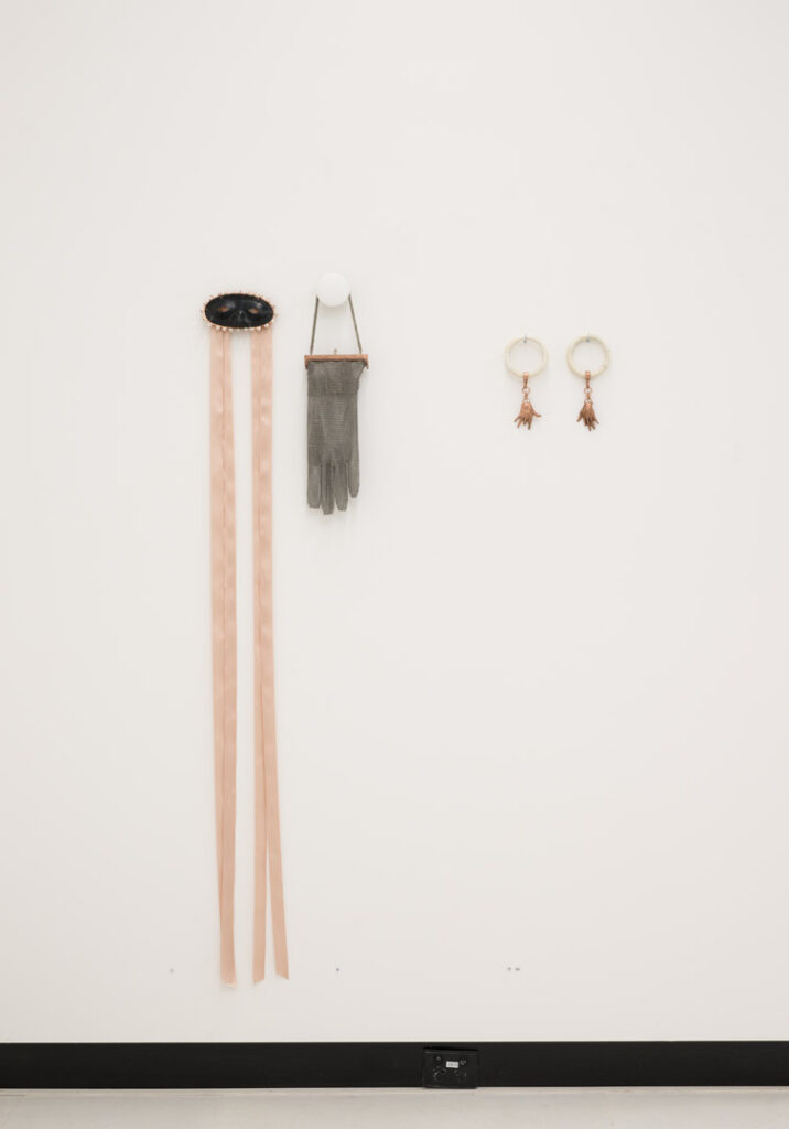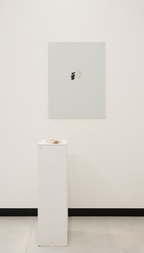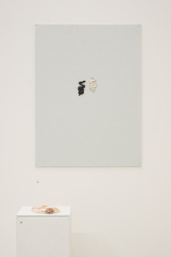 Modeled from the line drawings from Victorian-era women’s sex guidebooks, elegantly masturbating hands recur as a cheeky motif in Emily O’Brien’s jewellery works in Coil and Roar. It’s said that Victorian-era physicians prescribed masturbation, then called an ‘hysterical paroxysm’, for hysteria. In this exhibition, the quietly subversive, disembodied hands now stud bracelets and strands of pearls, a feminine-coded, ecological gem recurring across Biblical and ancient storytelling. In Emily’s other works here, serpents – mythological, fearful – unwind across chains in a self-conscious meditation on the lasting power of old cultural stories of patriarchal shame.