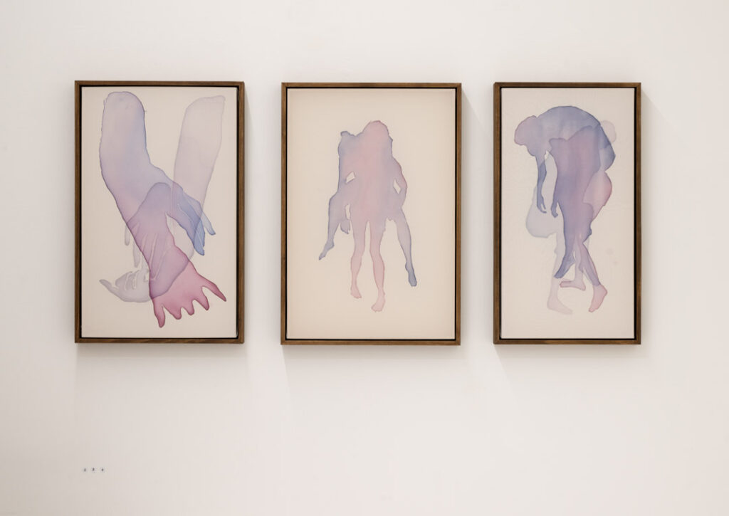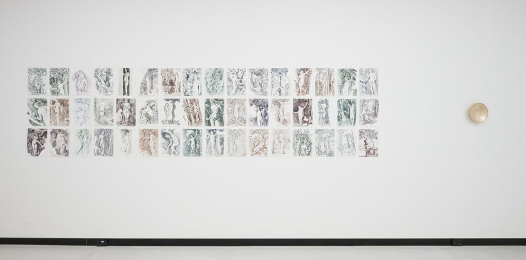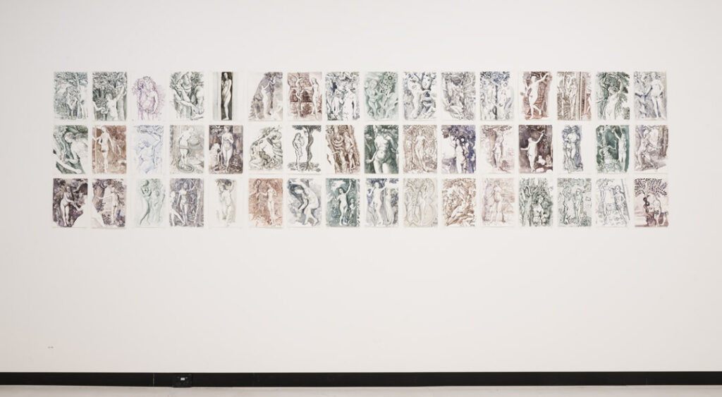 Clare Thackway’s new works mine the archives of the Warburg Institute in London for images of Eve the moment before the Fall, reconfigured in fifty-two watercolour paintings like imprints from the past — shadowy, single-tone images projected onto our present. We see Eve in a repeated schema from iconography, passed through the centuries, reinscribed by Clare as a deposition in femininity: the unstable, cursed, wild woman, writhing, witchy, sensual and at the centre of a secret flesh world. These recurring images of Eve do not so much represent the idea of transgression, but images that are wholly and surprisingly transgressive in and of themselves – Eve in an animalistic nature place, Adam trimmed almost out of frame or whited out. Cropping and reinscribing images as disparate as medieval woodcuts and engravings to William Blake and the Sistine Chapel, Clare reveals a rich, strange trove of Christian art – which is not what we might imagine; history crackles with fevered politics through iconography.