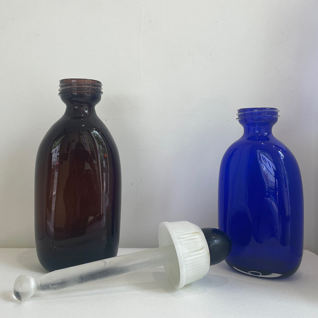 These works were conceived in the context of the Covid-19 pandemic and its public responses: rapid mandates, the intrusion into private life, and the expansion of institutional power. Against this backdrop, the bottles and droppers evoke a nostalgia for the apothecary and its traditional tinctures and treatments, standing in contrast to the vast logistics, industrial scale, and waste of contemporary medicine.